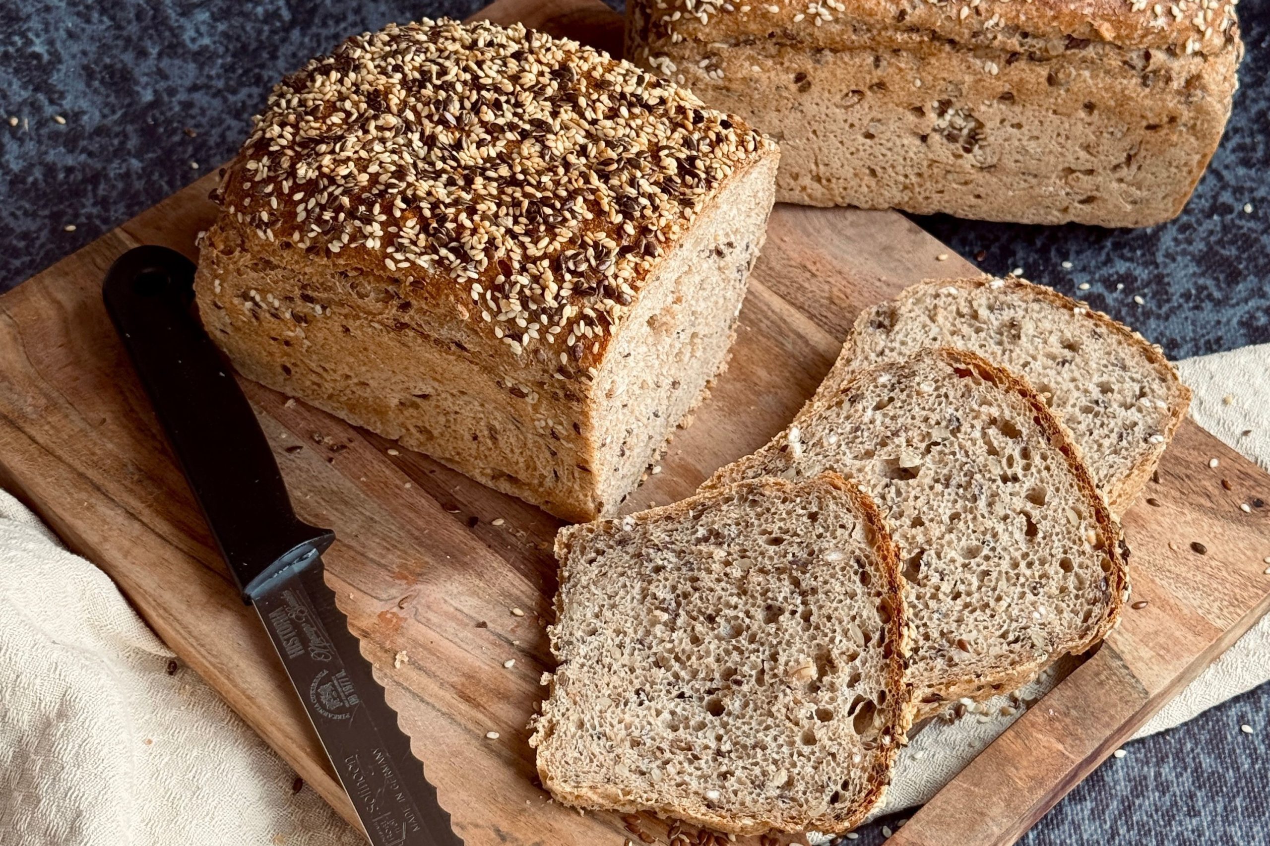 Pieczywo wypieczone z mąki orkiszowej, z niewielkim dodatkiem mąki graham i mąki pszennej, na zakwasie żytnim, z ziarnami słonecznika, ziarnami pszenicy i płatkami ziemniaczanymi.