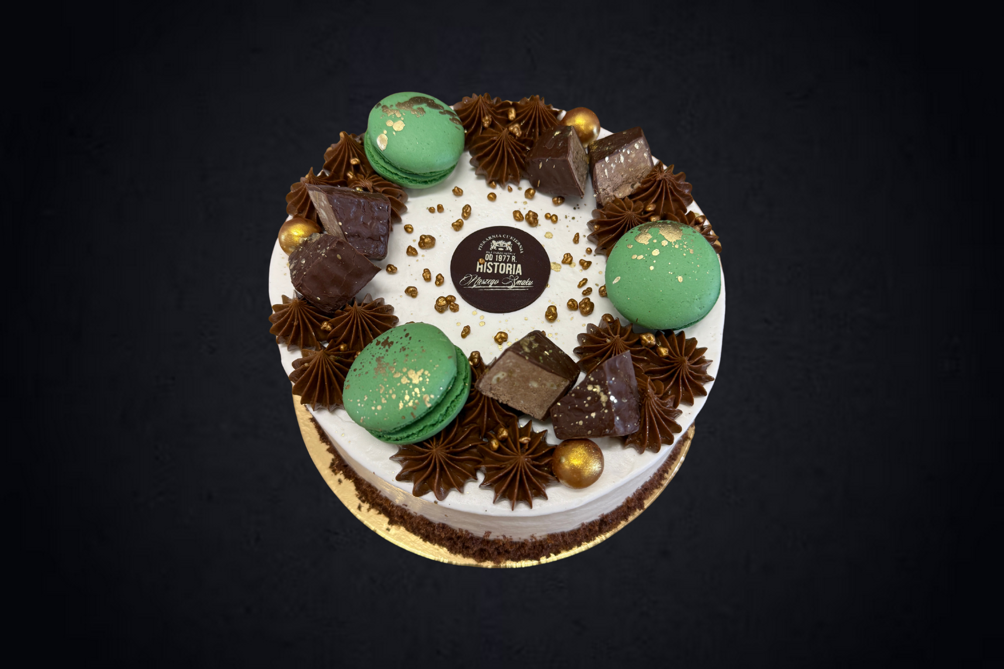 Trzy warstwy ciemnego biszkoptu przełożone nadzieniem czekoladowym oraz bitą śmietaną z dodatkiem wiśni, obsypany okruchami ciemnego biszkoptu.