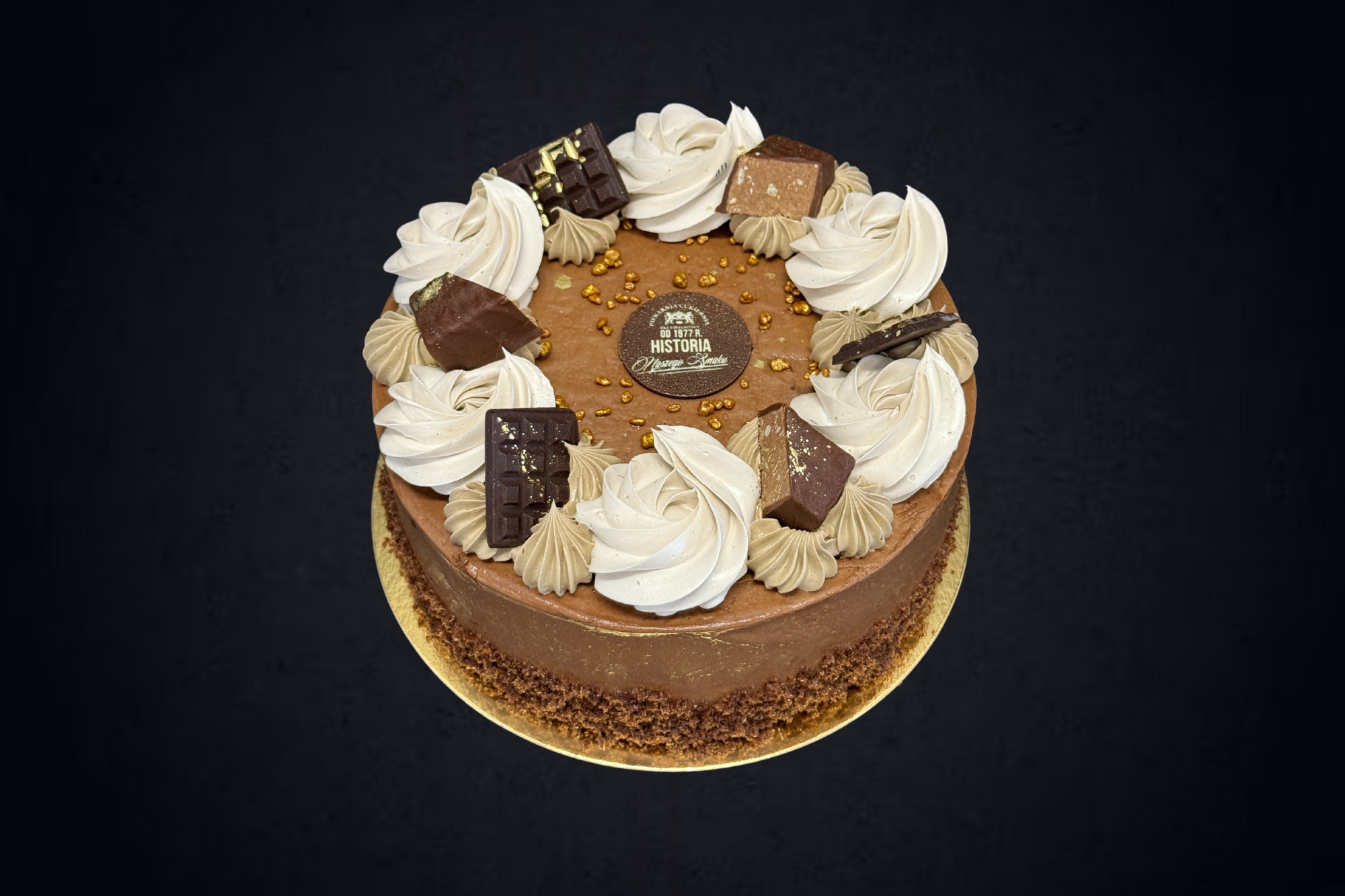 Tradycyjny tort czekoladowy na bitej śmietanie, na ciemnym, kakaowym biszkopcie nasączonym syropem. Wykończony delikatną dekoracją (wg życzenia klienta).