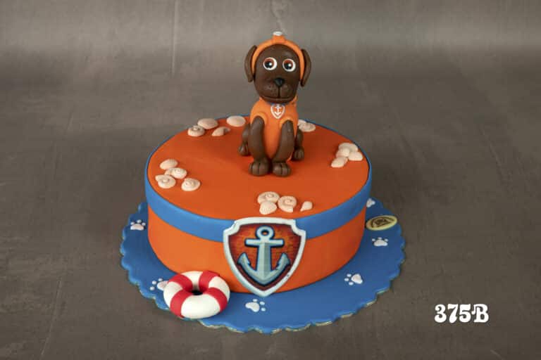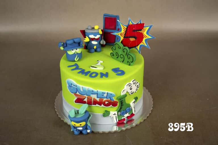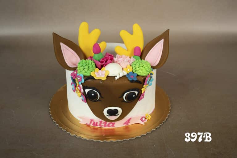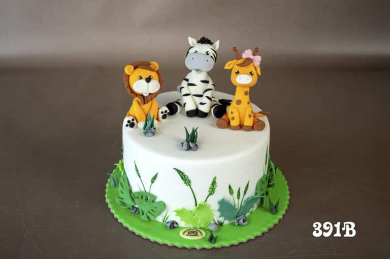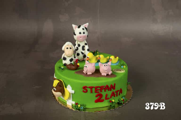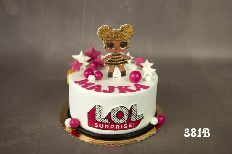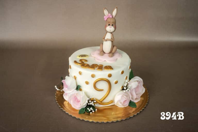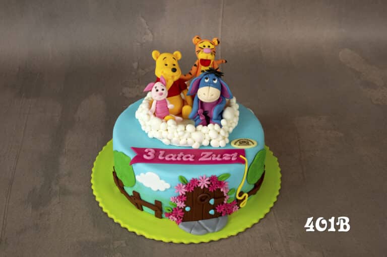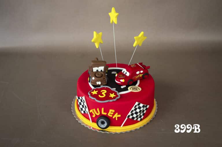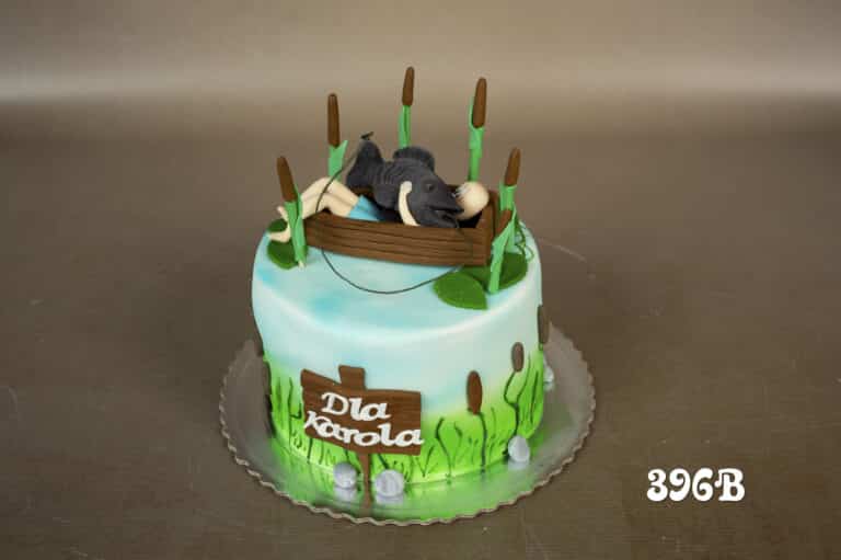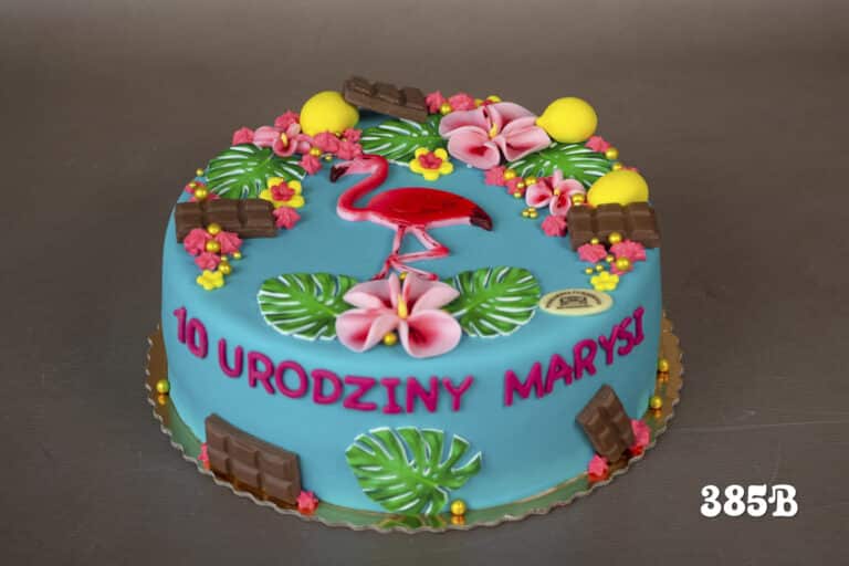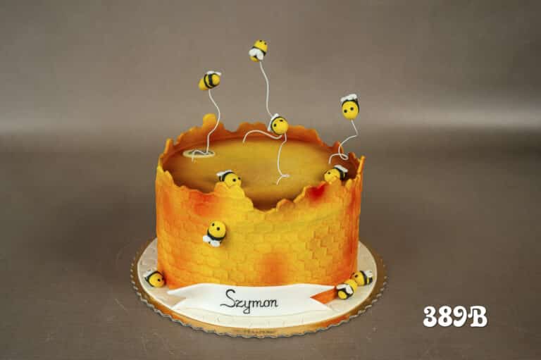 Nadzienie marcepanowe na jasnym biszkopcie nasączonym syropem, obłożony marcepanem z dodatkiem delikatnej dekoracji.