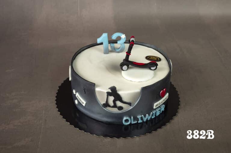 Kakaowy delikatny biszkopt nasączony wisniówką, przekładany bitą śmietana wiśniową z dodatkiem wiśni w żelu. Wykończony okazjonalną dekoracją.