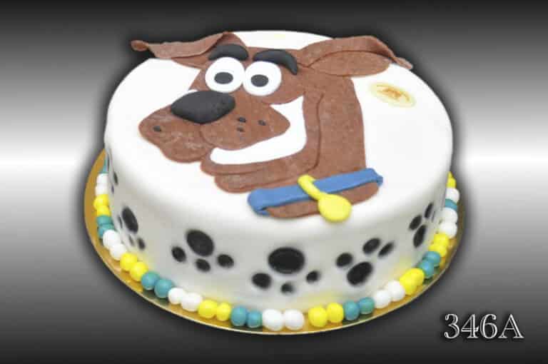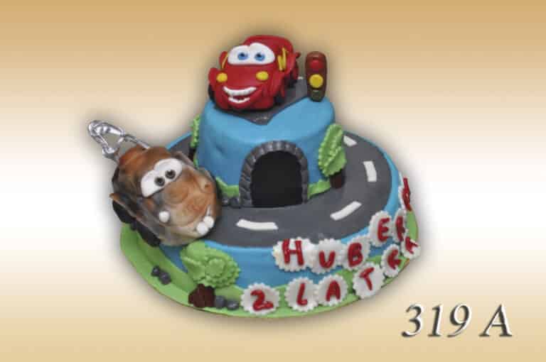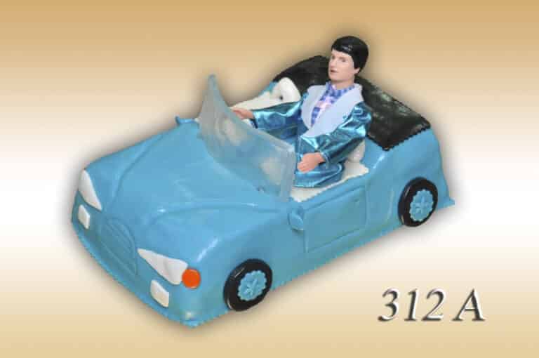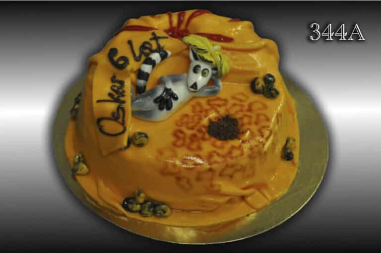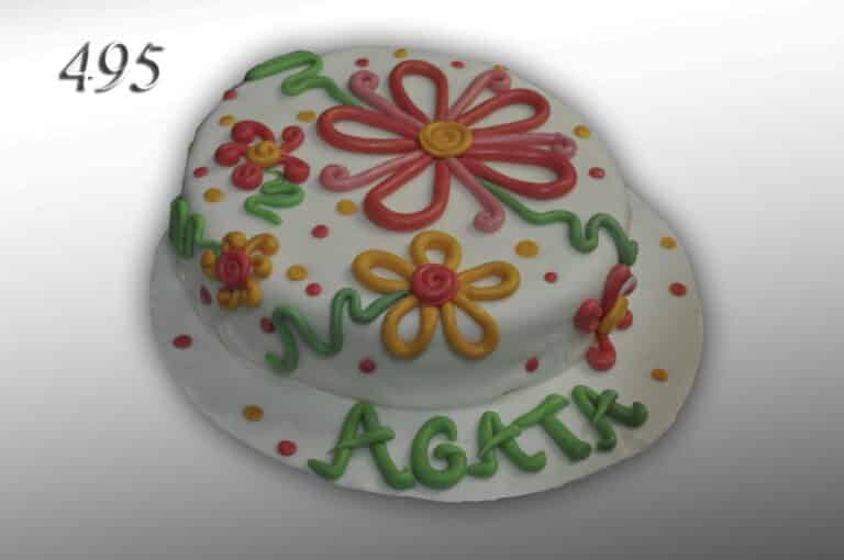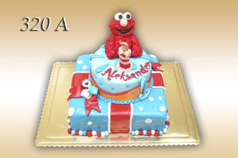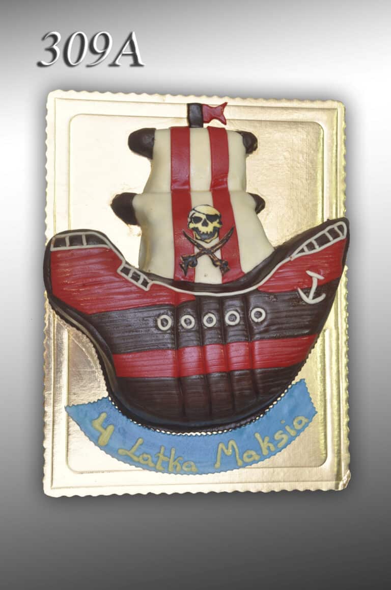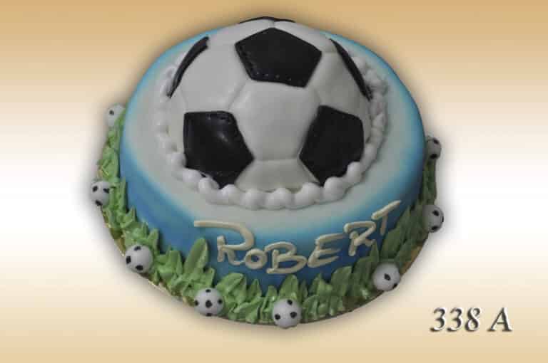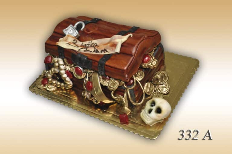 Nadzienie marcepanowe na jasnym biszkopcie nasączonym syropem, obłożony marcepanem z dodatkiem delikatnej dekoracji.